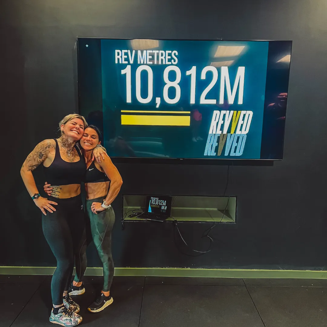 Revved is our signature team fitness event designed to test your power, endurance, and teamwork across three high-energy workout stations. Unlike HYROX, there’s no running—just intense, structured blocks featuring equipment like rowers, ski ergs, sleds, and more. You’ll compete in pairs, push through 15-minute work stations, and see your total metres live on the leaderboard. It’s fast-paced, challenging, and built for all levels — with coaches and music keeping the energy high from start to finish.